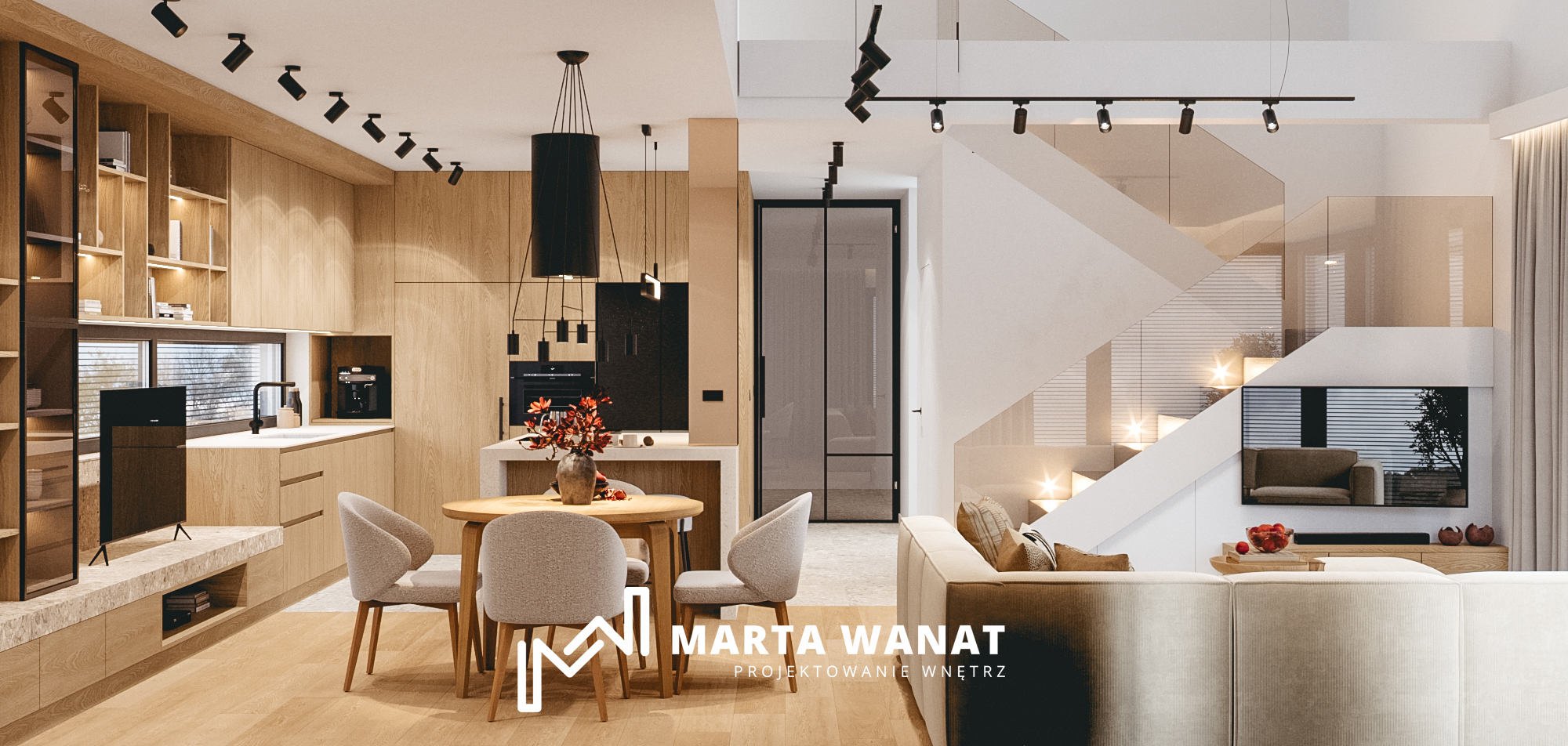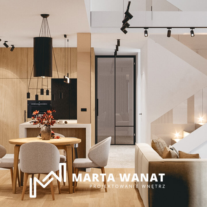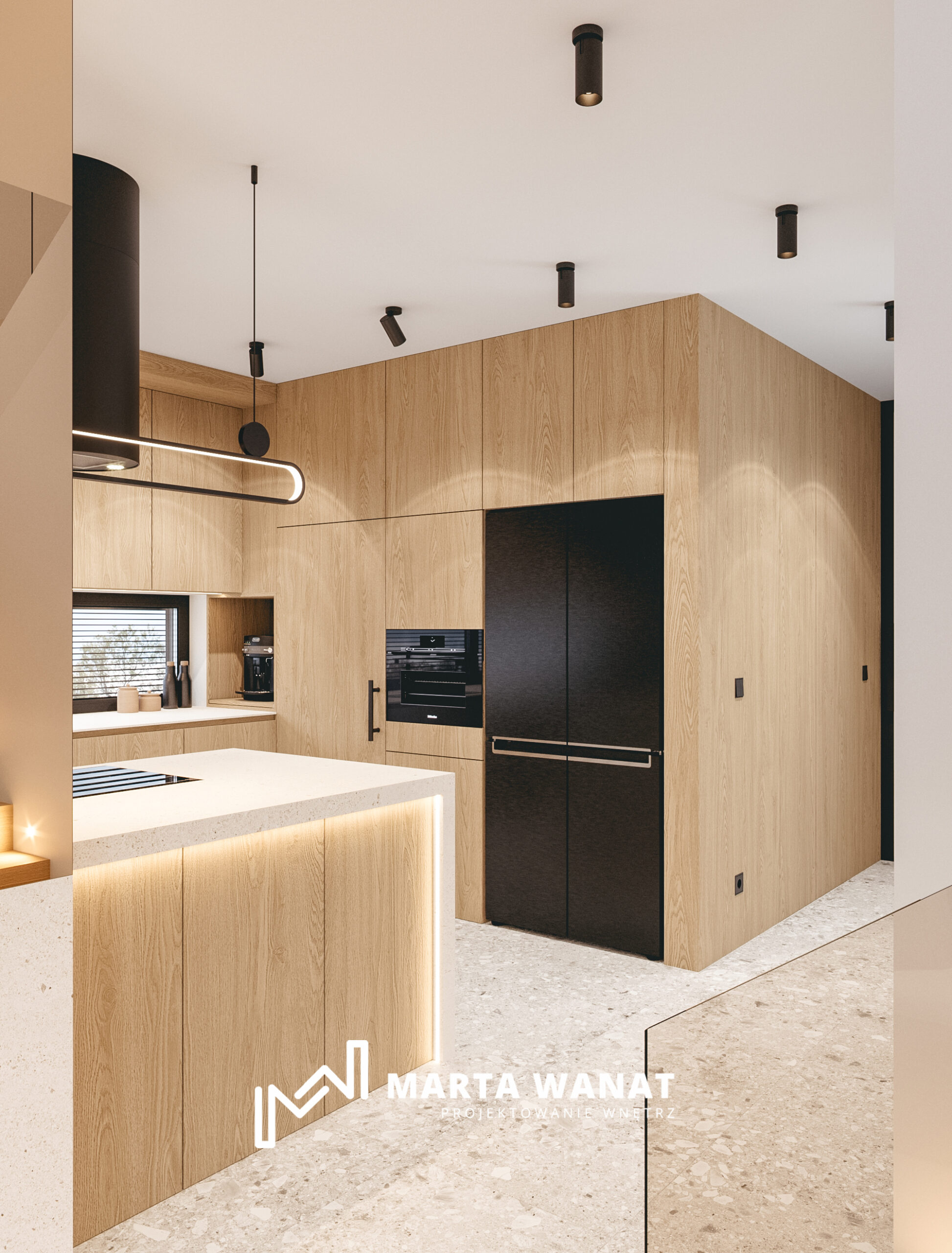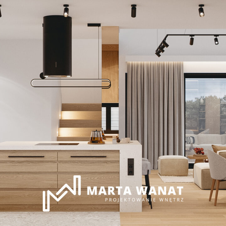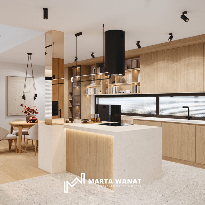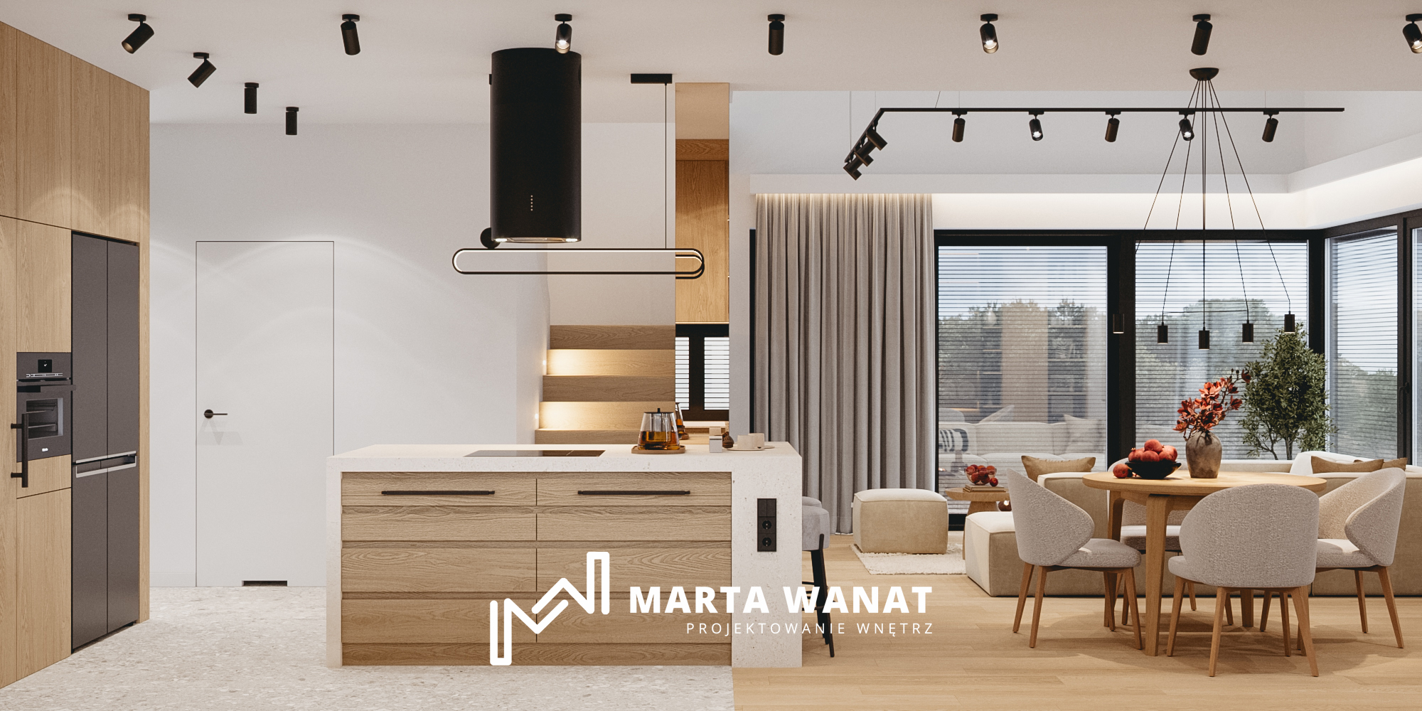 Wnętrze domu w stylu minimalistycznym zostało zaprojektowane z myślą o rodzinie. W centrum znalazła się otwarta strefa dzienna - kuchnia, salon i jadalnia - zaprojektowane tak, aby płynnie się przenikały. Minimalistyczne dodatki podkreślają nowoczesny charakter wnętrza.